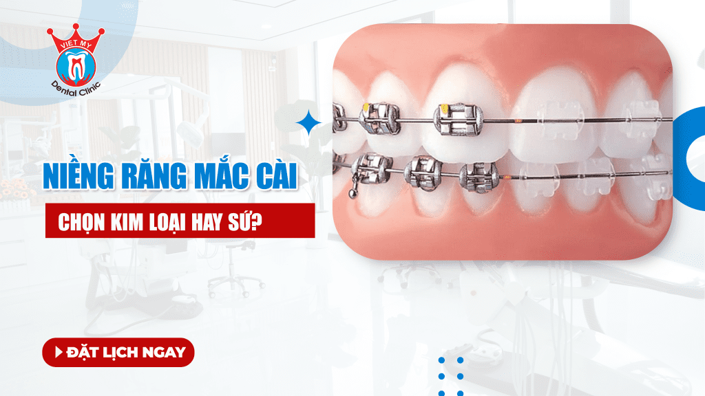 Niềng răng mắc cài là phương pháp hiệu quả để chỉnh răng lệch lạc, hô móm hay khớp cắn sai. Khi tìm hiểu, nhiều khách hàng thường băn khoăn giữa mắc cài kim loại và mắc cài sứ: loại nào tốt hơn, thẩm mỹ hơn, và chi phí ra sao? Bài viết này sẽ phân tích chi tiết từng loại mắc cài, ưu – nhược điểm, cùng các tiêu chí chọn lựa để giúp bạn đưa ra quyết định phù hợp nhất tại Nha Khoa Việt Mỹ – Gia Lai.